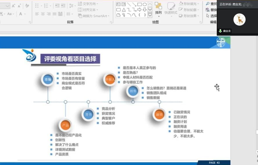 鹿老师讲解了今年大赛相对于往届大赛的新变化,同时着重对同学们关注点较高的“评委视角看项目选择”部分进行了讲解,从“市场”、“产品”、“背书”、“申报人”、“销售”、“融资”六个方面共24个点逐一分析,对大赛PPT的准备也分享了详细的制作要领,令同学们受益匪浅,照亮了同学们的参赛之路。