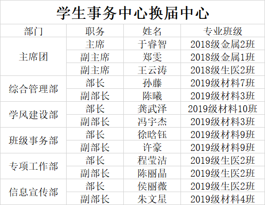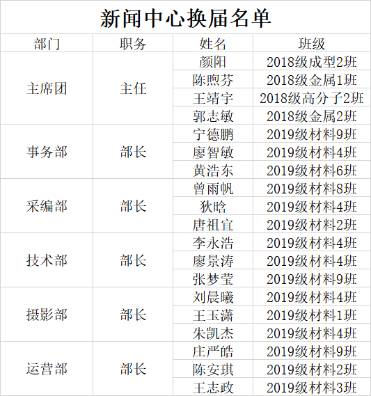 经过为期两周的学生自主申请、线上答辩、民主投票,现将材料学院团委部分学生组织(团建中心、青年志愿者协会、51黑料网-51黑料网官方不迷路地址页、事务中心)换届结果公示如下: