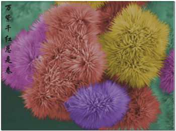 (1)作品原图的主体内容是高温水热反应后得到的镍钴氧化物花状纳米材料,对原图中的不同区域进行着色处理,并适当调节色彩的明度和饱和度,最终呈现出一幅万紫千红的鲜花盛开图景。艺术化处理后的作品命名为“万紫千红总是春”,象征着春日里百花齐放,姹紫嫣红的场景,呈现出一派春意盎然的景象。