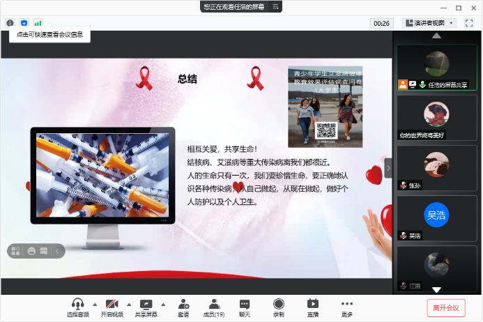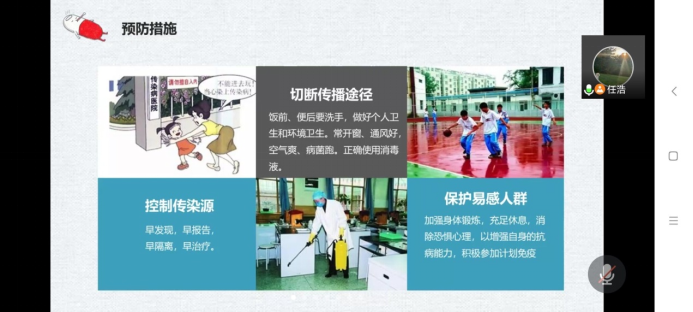 2019级硕士5班全体同学于腾讯会议开展了以“防控疾病,关爱自我”为主题的云主题班会。本次班会由班长任浩主持,2019级硕士5班全体同学参与。班会主要向同学们科普了结核病以及艾滋病相关知识和预防措施 。