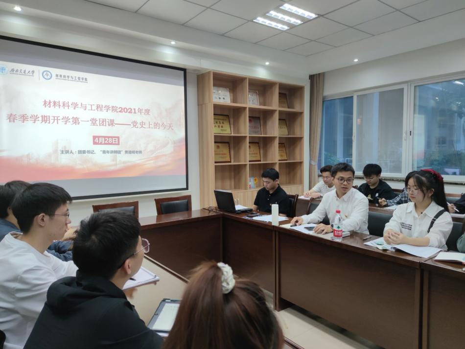 2021年4月28日19:00,材料学院团委在X2128开展了2021年度春季学期第一堂团课。参与本次团课的有材料学院团委书记黄德明、团建中心指导老师许欢、本科全体团支部书记和新发展团员,本次团课由黄德明老师主讲。