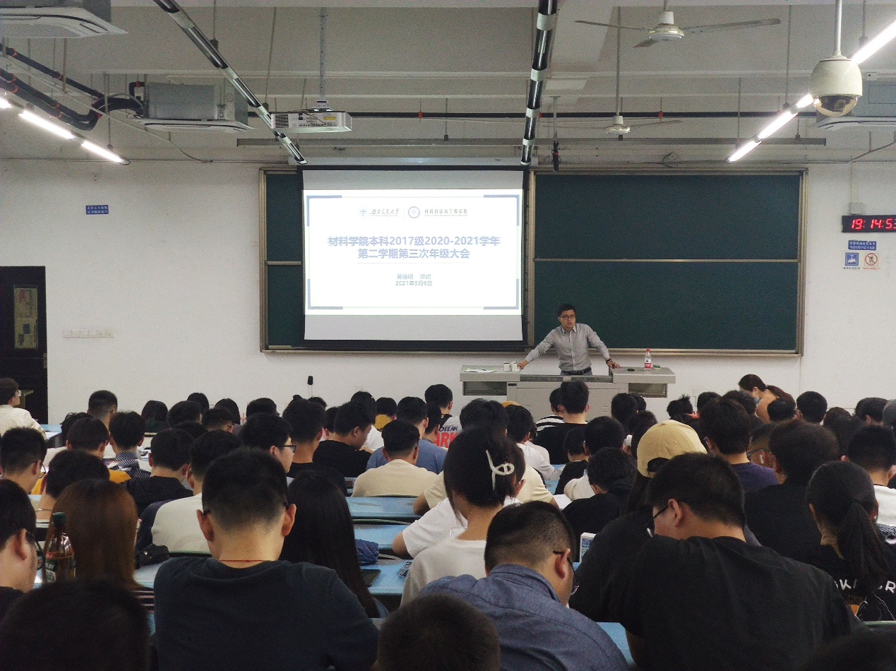 2021年5月6日19:00,材料学院本科2017级在犀浦校区X2218召开了2020-2021学年第二学期第三次年级大会,2017级全体同学参会,2017级辅导员黄德明、许欢出席并主持了会议。