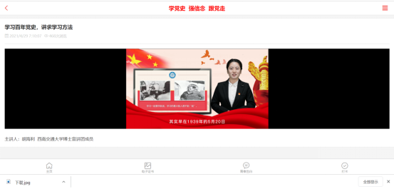 之后,大家学习了党史微团课,主讲团的讲师们声情并茂地讲述了百年党史,加深了广大青年对中国共产党的认识,加速培养青年爱党爱国,为祖国贡献青春力量的决心。学习完成后,大家奏唱团歌,在歌声中回忆党史,坚定青年团员不忘初心,牢记使命的信念。