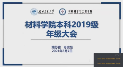 材料学院本科2019级2020-2021学年第二学期安全教育专题大会于2021年5月7日21:00,在钉钉平台顺利召开。本次会议由2019级辅导员熊苏雅主持,2019级全体成员参与会议。