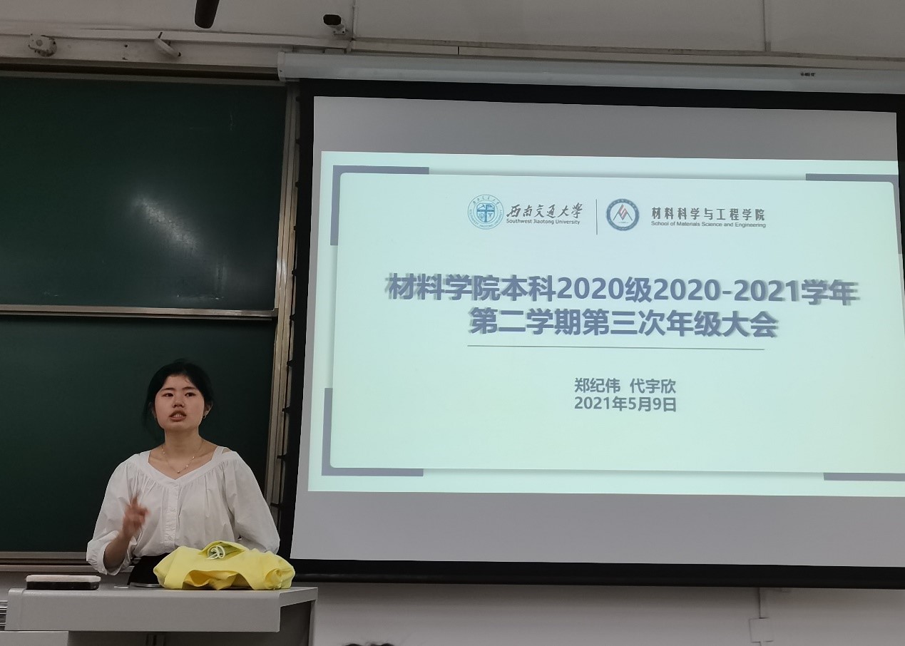 2021年5月9日星期日晚20:00,材料学院本科2020级于犀浦X2316、X2317召开了2020-2021学年第二学期第三次年级大会,辅导员郑纪伟、代宇欣以及2020级全体同学参与了本次年级大会。本次年级大会主要从宿舍安全、防电信网络诈骗、四六级考试动员、党史学习及疫苗接种注意事项展开。