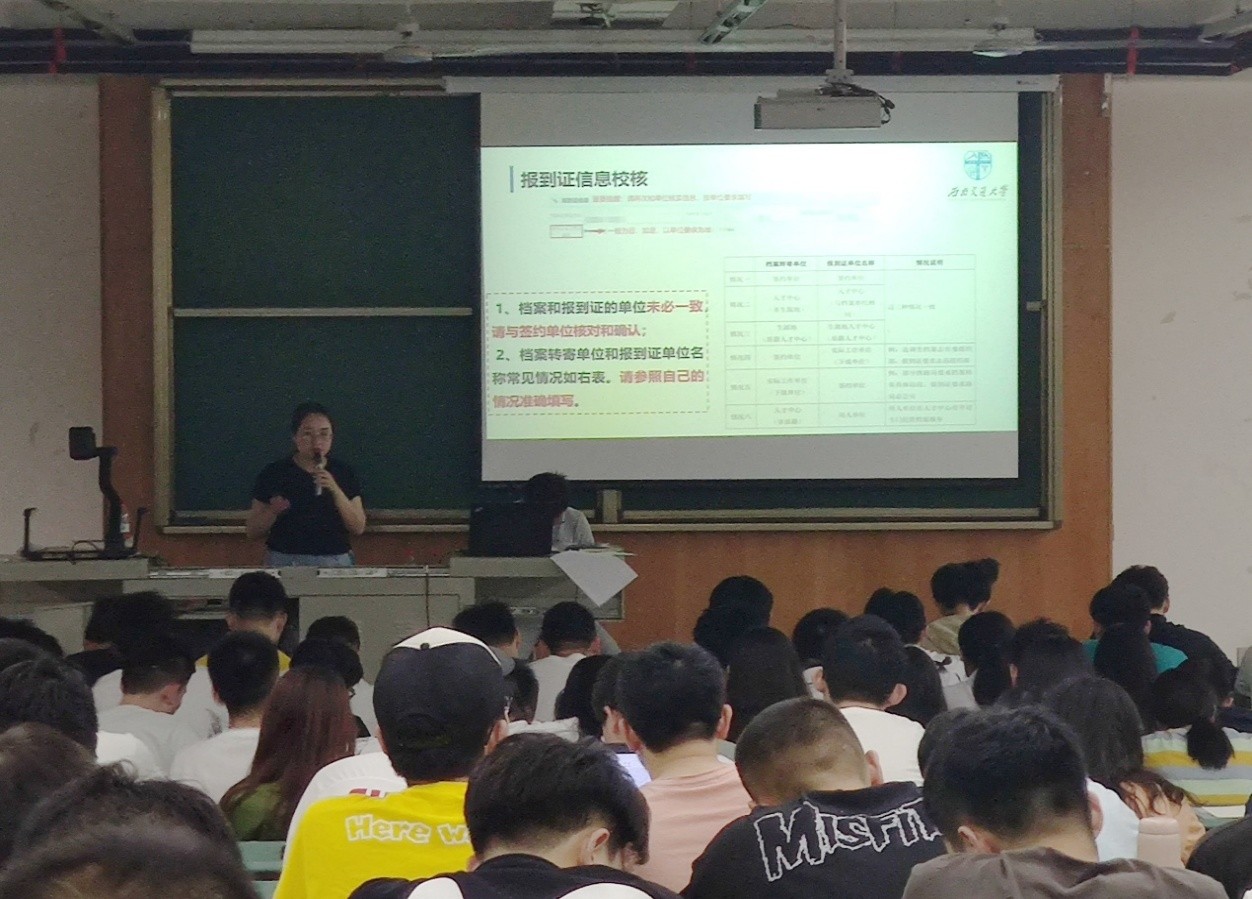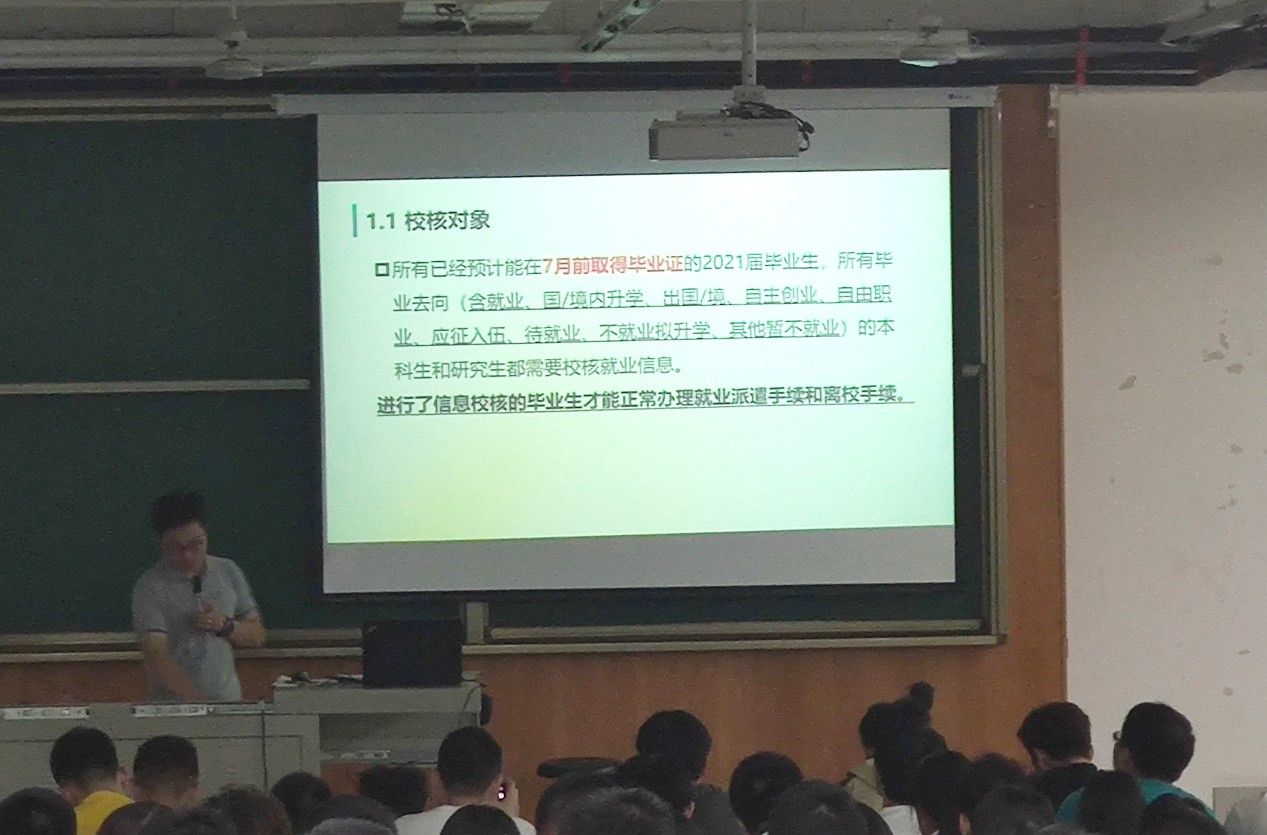 会议第二项,黄老师对就业信息、户口信息和档案信息三方面的校核工作进行了详细的说明和讲解。针对就业信息校核,黄老师强调了校核对象、校核时间和具体校核内容,对校核的具体操作和相应校核信息类别进行了详细的讲解,以帮助同学们根据自身实际情况进行校核;对于户口信息的校核工作,黄老师分别对其包括的三大类情况进行了详细说明,包括不同类型和具体选项的定义、校核流程和操作方法,强调了户口信息校核的重要性和必要性,此外详列出了“毕业生办理户口迁移须知”和“毕业生申请办理户档留校通知”的相关细则,对其中比较重要的条例进行了说明和强调,对相应办理及审批流程、注意事项进行了特别提醒;在档案信息校核工作上,黄老师对于档案材料的归档和填写要求、转递流程与方式、档案查询与利用进行了详细说明,强调了需要准备的归档材料、校核信息的类别及档案的重要性,警醒同学严格按要求进行相应校验和准备工作,确保档案信息不出差错。