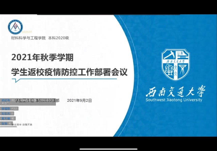 2021年9月2日晚上8点,材料学院本科2020级通过钉钉平台召开暑期第二次年级大会,辅导员老师郑纪伟、杨婷参加大会,围绕秋季学期返校安排以及疫情防控工作要求等向同学们作详细讲解。2020级300余名未返校同学参加大会。