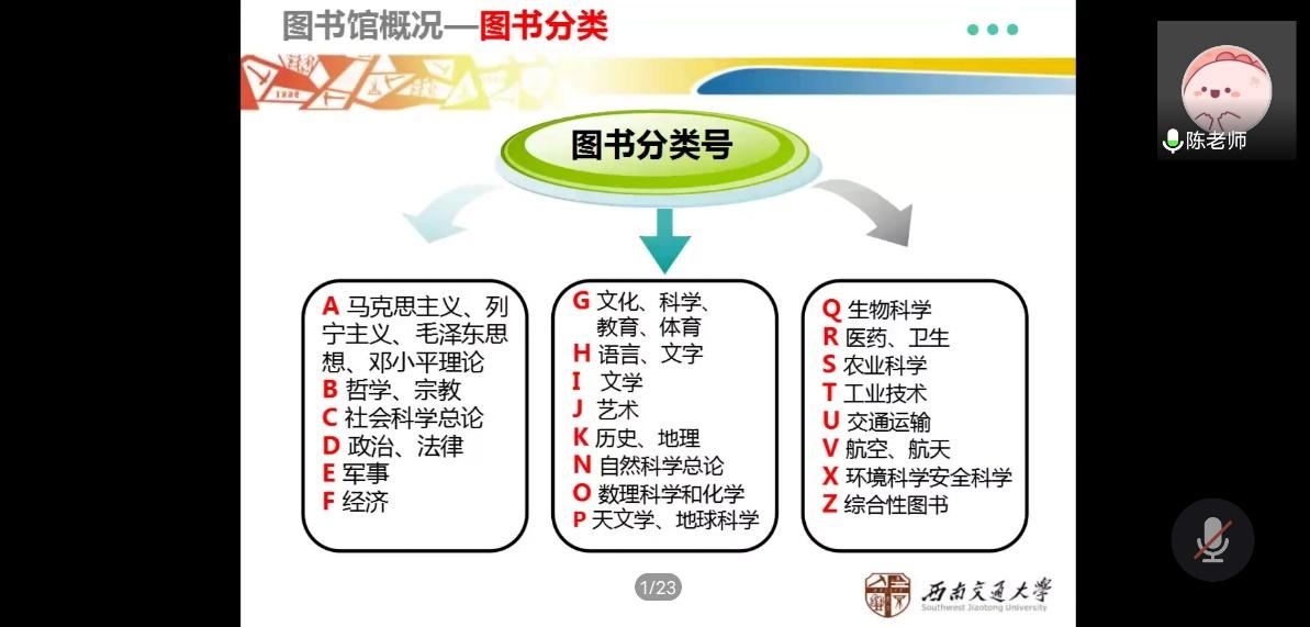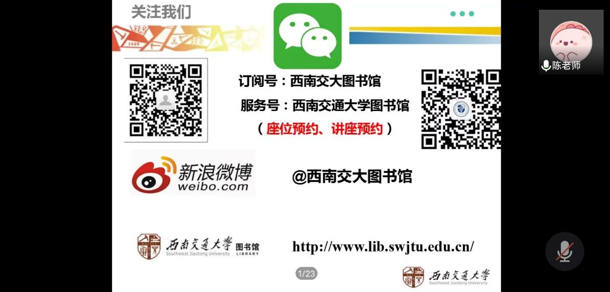 陈老师从馆藏布局到资源外延做了系统地介绍。期间,陈老师从图书馆的物理布局、馆藏资源和基本服务三个方面展开介绍,着重讲解了数字资源的利用,图书馆官网的使用,以及文献检索的相关知识。