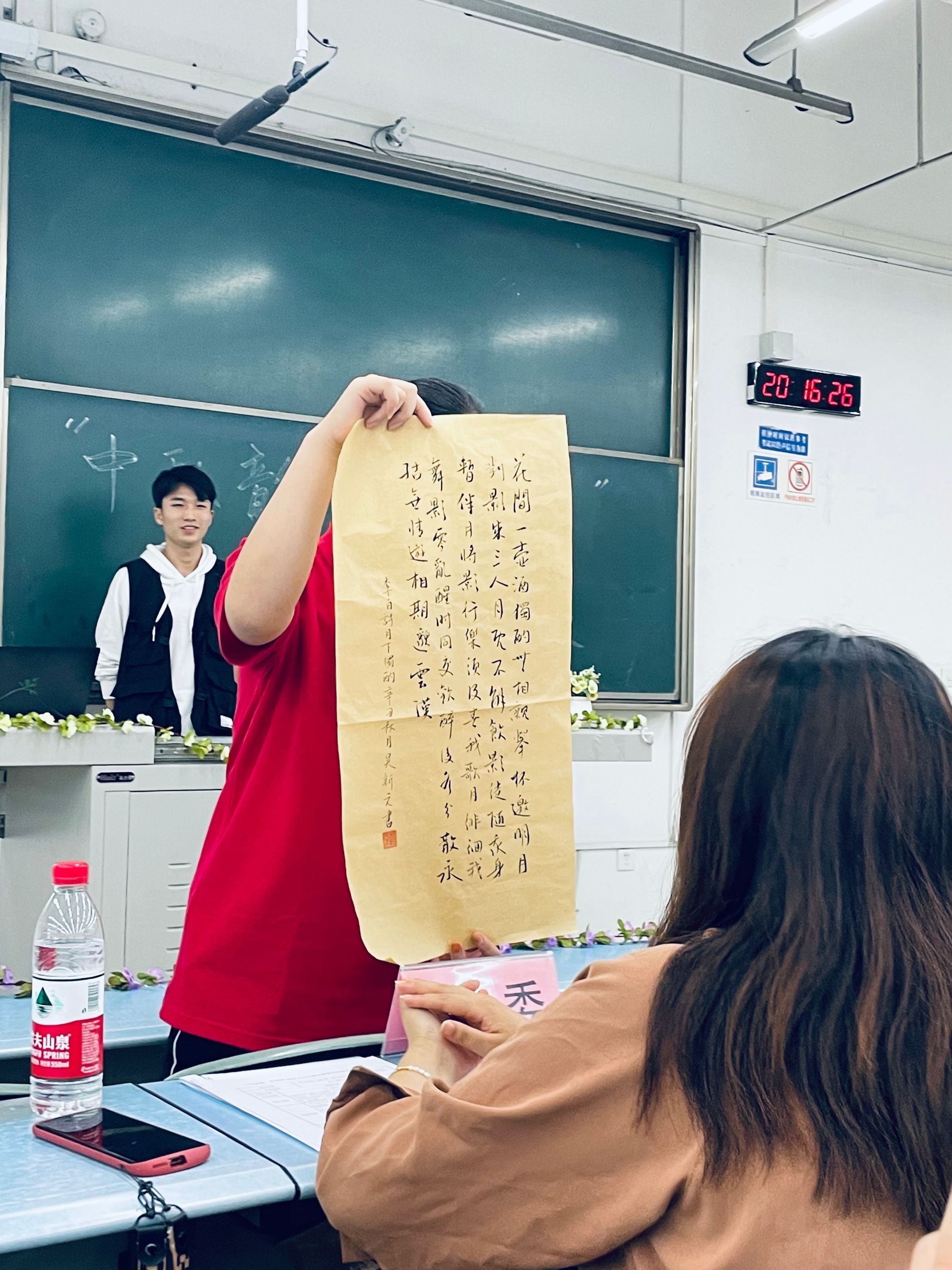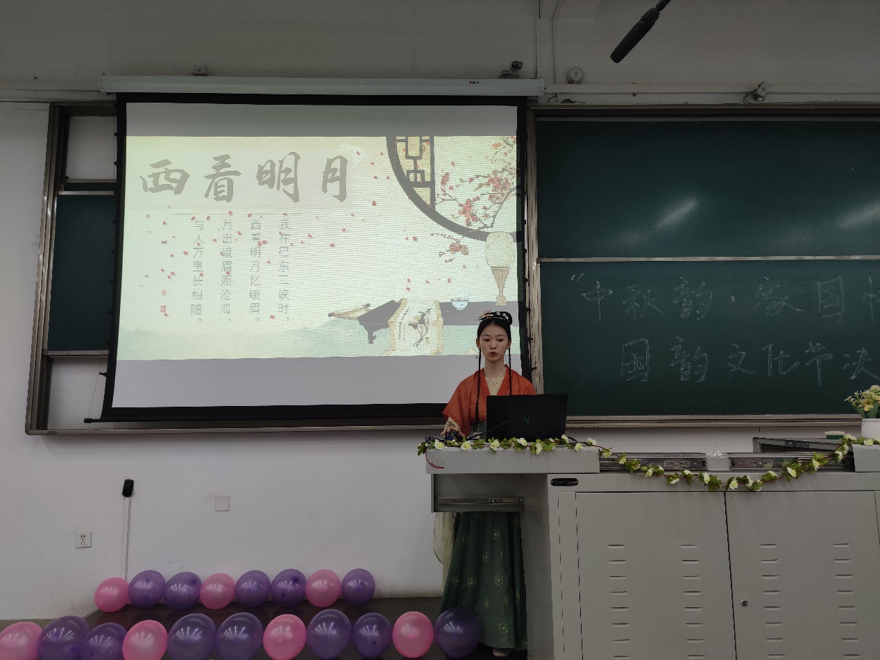 在全部作品展示后,许欢老师对活动进行了总结,指出中国传统文化作为我们民族的精神家园、精神寄托,挖掘、学习、传承、弘扬和创新我们的传统文化是一代又一代人的责任与义务。许欢老师代表学院团委向校团委的精心指导,各兄弟学院的大力支持以及各位参赛选手的积极参与表示衷心的感谢。
