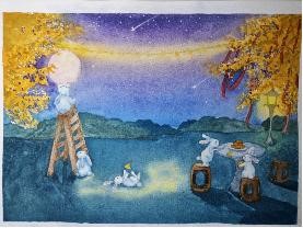 主持人石瑾、朱炫优宣布决赛正式开始,经过层层选拔入围的12件作品依次展示,参赛选手对自己的作品的创作思路、寓意做了精彩的讲解。有展现家人闲坐,灯火可亲之景的画作;有表达美美与共,家家相亲祝福的传统剪纸。既有传承前人以月为主题的文化创作的书法展示,也有以小见大,从月饼为切入描绘中秋佳节的手工作品,向现场观众传达了对传统文化、家、国的热爱之情。