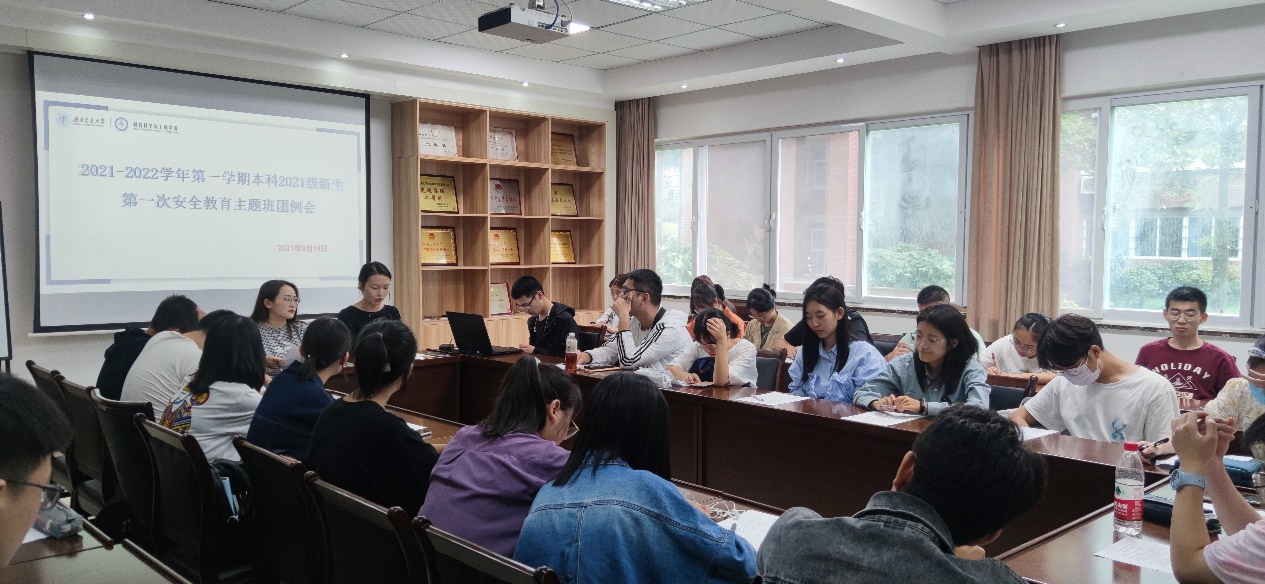 9月18日下午13:00,2021级辅导员许欢,董海霞主持召开新生第一次安全教育主题班团例会,2021级班长,团支书,生活委员全员参会。首先,许欢老师强调宿舍用电安全,违规电器使用等相关处理办法。随后,董海霞老师安排各班召开安全教育主题班会和宿舍安全检查,强调同学们注意节假日出行安全。