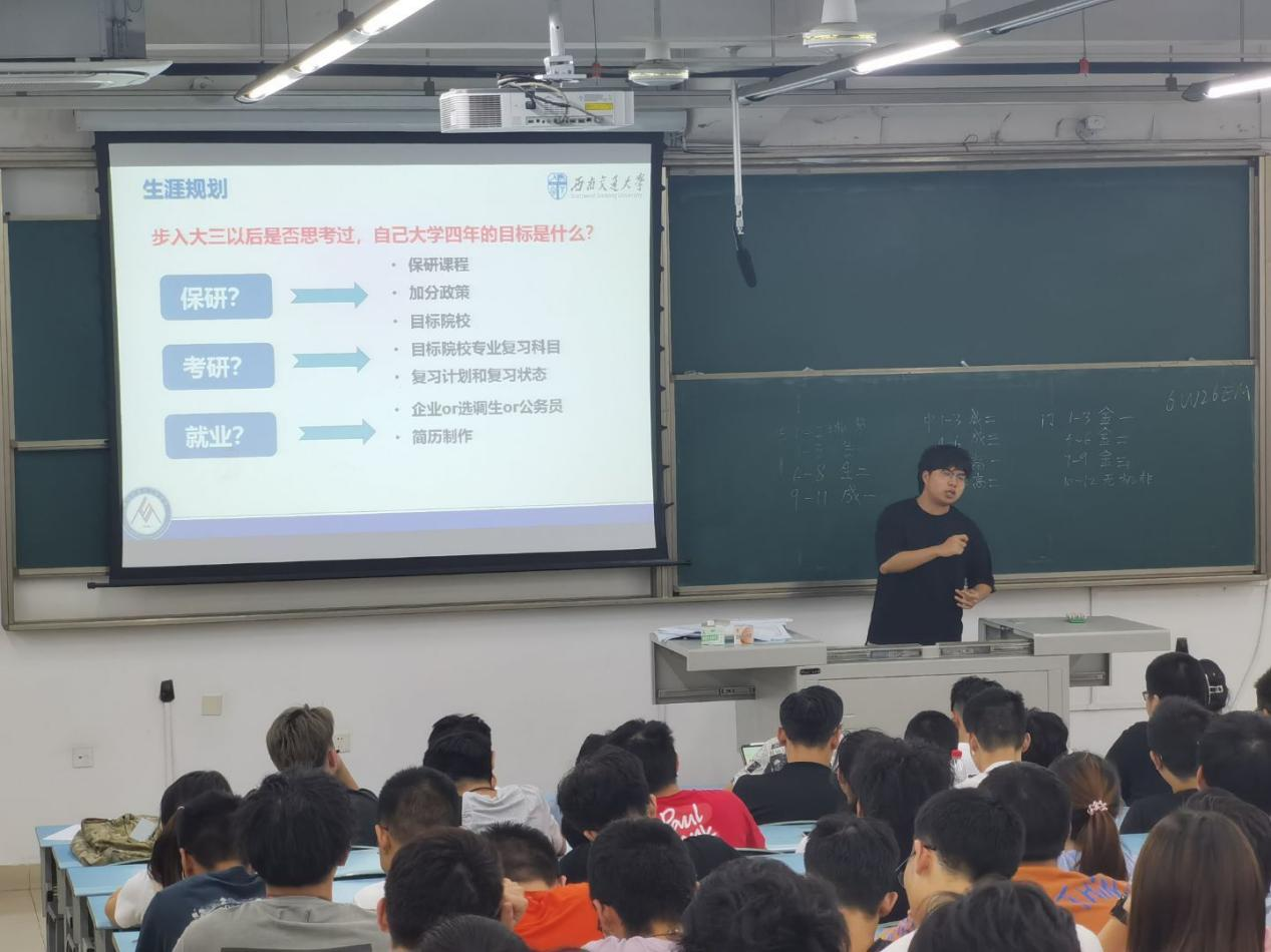 随后,由材料学院2018级于睿智同学为学生作保研经验分享,并就保研、考研流程进行详细介绍,分享材料学院往年考研录取比例,重点提醒对保研、考研有意向的同学,需从大三开始,提前开始着手准备,并讲解了认清自己的定位对保研、考研上岸的重要性。期间,于睿智同学用幽默风趣的语言,对未来生涯规划的重要型,分享了自己的见解。最后,于睿智同学为了解同学们未来生涯规划,制作了一个生涯规划意向调查表。