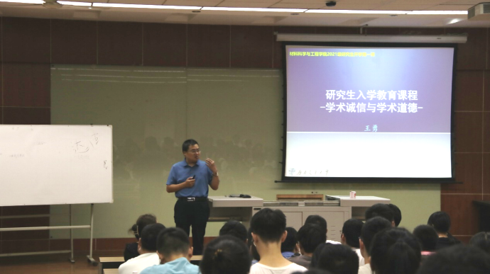 研究生的安全意识,强调研究生学术诚信的重要性,2021年9月29日晚19时,材料学院2021级全体研究生于九里校区J4104教室开展学术诚信教育活动。本次会议由辅导员罗丹主持,材料学院王勇教授主讲。本次活动旨在加强研究生学术诚信教育,强化学生诚信意识,营造良好的学术氛围;并让同学们了解到学术研究的底线,必须严格坚守学术诚信,自觉抵制学术造假行为。