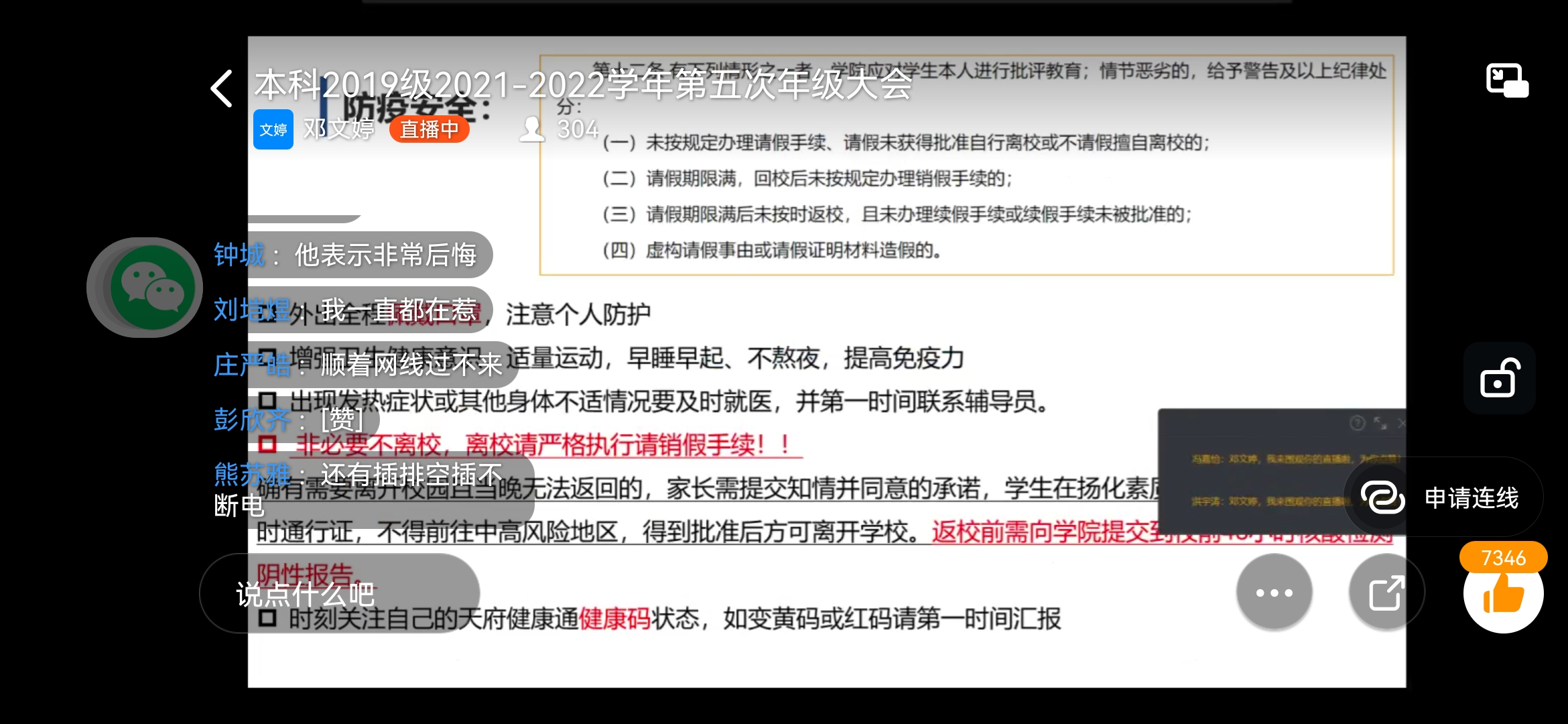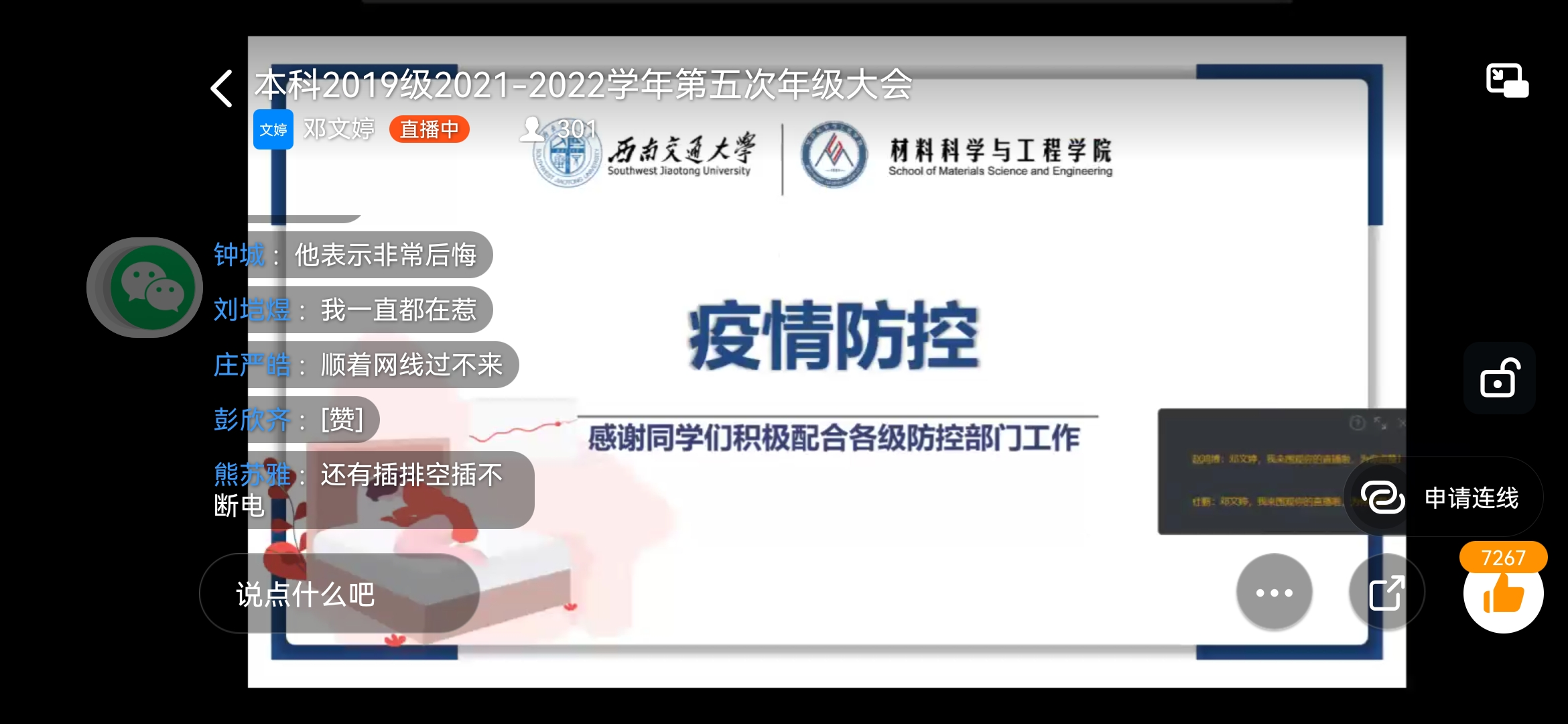 最后,熊苏雅再次强调疫情防控事宜,同时提醒同学们关注学校通知以及课程教师的安排,也不要因为“上网课”而懈怠。在邓文婷解答了一些同学们的疑问之后,本次大会圆满结束。