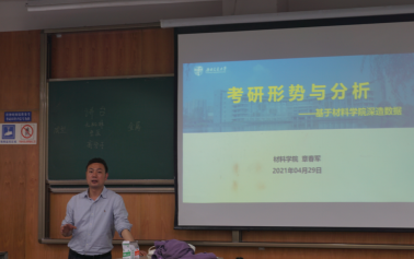 2021年4月29日19:00,材料学院“研途”训练营为同学们准备了一次考研形式分析讲座,此次讲座在犀浦校区X4158召开,邀请了材料学院党委副书记章春军书记为同学们讲解考研形势,训练营负责老师辅导员梁喻嘉、罗丹主持。