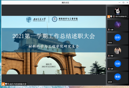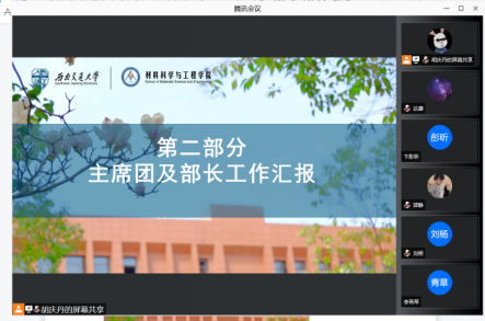 研究生会通过腾讯会议在线上举行了述职大会。参加此次会议的有研究生会指导老师罗丹,材料学院院级评议会成员以及研究生会成员,会议由研究生会执行主席胡庆丹主持。