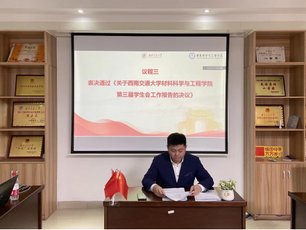 第三次学生代表大会顺利召开。本次学生代表大会由材料学生会执行主席孙诗然主持。此外,材料学院党委副书记章春军,学院团委书记黄德明,学生会指导老师梁喻嘉,校会主席王晓婷出席了本次学生代表大会。