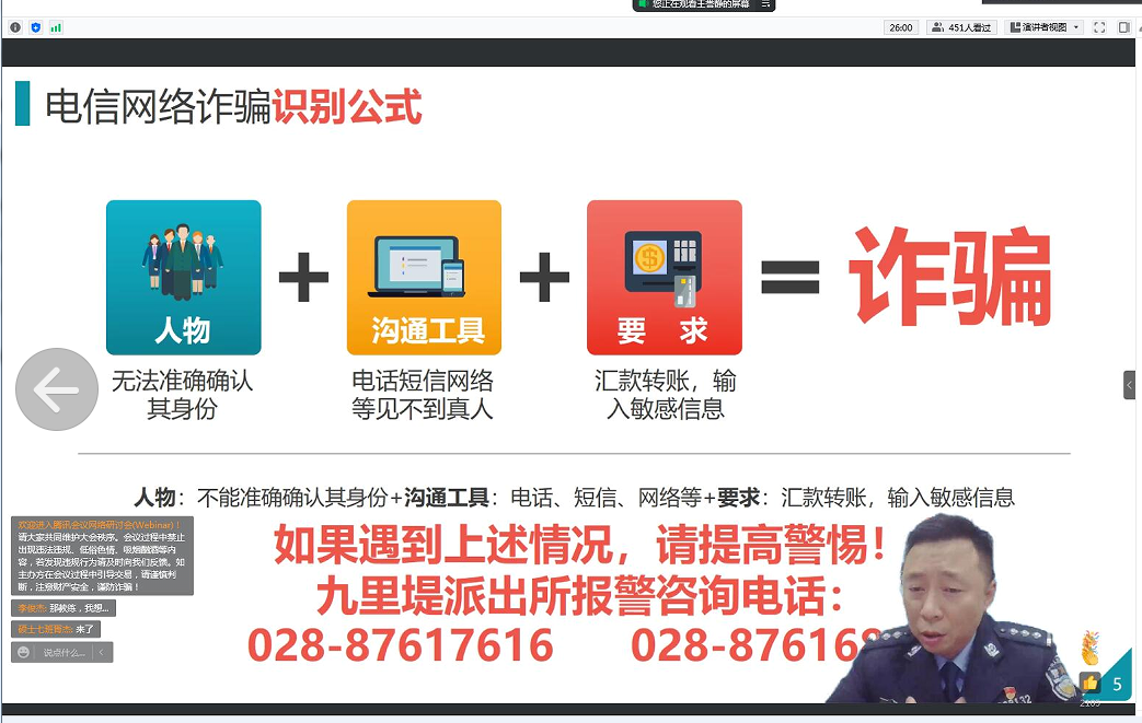 为加强研究生自我防护教育,确保校园平安、稳定、有序,进一步预防电信网络诈骗,普及反诈骗知识,材料学院积极开展2022“铸盾”研究生安全教育活动。2022年3月22日晚19:00,材料学院学生工作组邀请九里堤派出所赵磊警官为全体研究生开展了“筑堤九里,守护平安”防范电信网络诈骗专题教育。