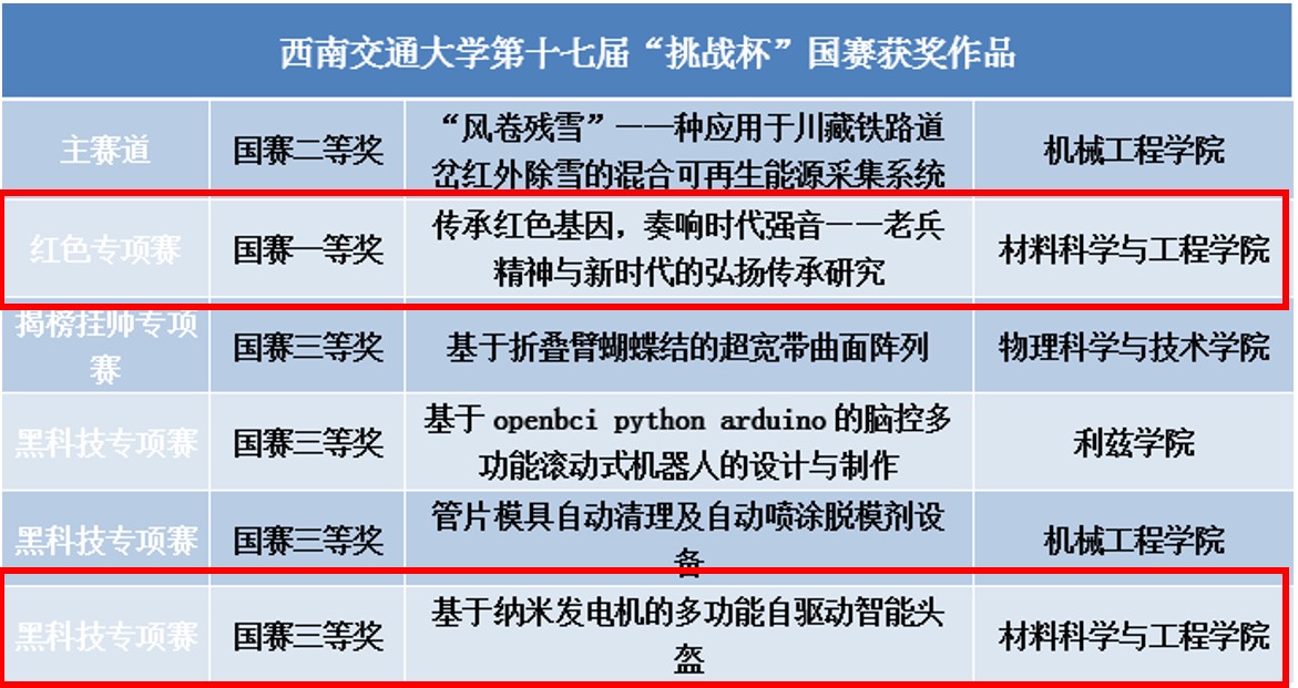 选送的《传承红色基因,奏响时代强音——老兵精神与新时代的弘扬传承研究》从全国10000余件作品激烈角逐中脱颖而出荣获红色专项赛全国一等奖,《基于纳米发电机的多功能自驱动智能头盔》荣获黑科技专项赛全国三等奖,取得材料学院在该项赛事中的最好成绩。