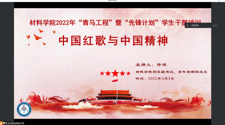 2022年5月4日15:30,材料学院2022年度“青马工程”暨“先锋计划”学生干部培训第二专题——“中国红歌与中国精神”顺利举行。本次培训由材料学院团委副书记、青年讲师团成员许欢主讲,参与培训的有学院本科各年级和学生组织学生骨干,以及2022年度新发展团员。