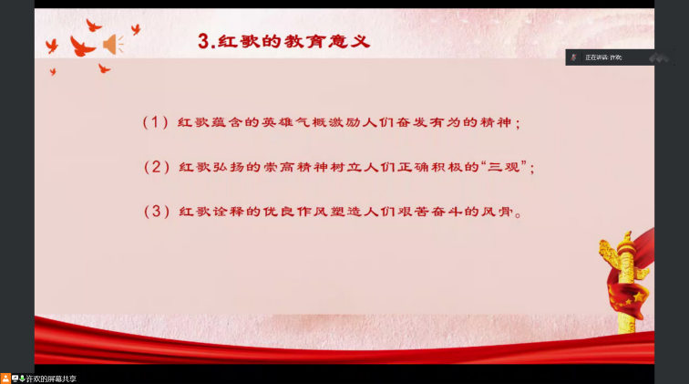 培训最后,许欢老师鼓励同学们学习红歌,传唱红歌,并用实际行动践行红歌中蕴含的伟大精神,培养自己顽强拼搏、艰苦奋斗的品质,勇担时代重任,不负历史使命!