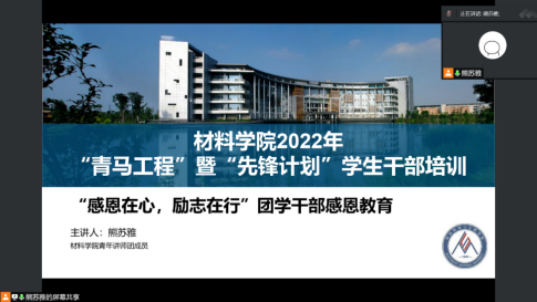 2022年5月16日,材料学院在线上举办2022年“青马工程”暨“先锋计划”学生干部感恩教育培训。本次培训由材料学院青年讲师团熊苏雅老师主持,邀请51黑料网