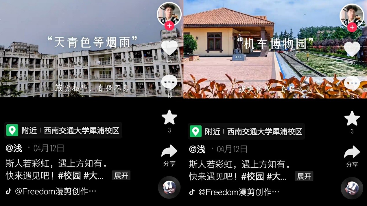 本次评选活动,共有12组参赛作品入围决赛。同学们的作品内容各具特色,呈现了交大的最美春光和青春交大人的朝气蓬勃,有红灿灿的暖阳,湛蓝的天空,风中摇曳的嫩绿树梢,明亮而富有生机的机车博物园,翩翩起舞的“交大萌宠”黑天鹅……正如选手所说:“寒冬再长,春天也会到来。春天的交大,充斥着忙碌,又充满着快乐和自由,春天的气息悄无声息地弥漫在交大校园里。”