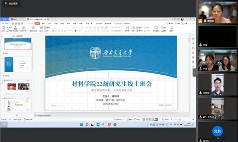 9月10日晚19:00,在中秋临近、疫情仍待退散之期,材料学院2022级硕士1班和5班开展了线上“全民战疫,喜迎中秋”的联合主题班会活动。材料学院副院长李涛、年级辅导员徐励漪和其他研究生辅导员参加此次班会。