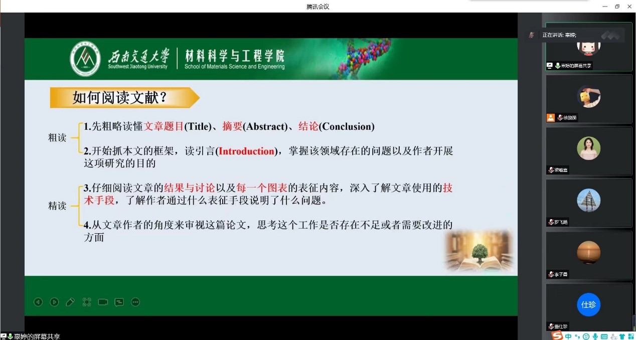 研究生更好开展科研活动,端正自己的科研态度,营造积极的学术氛围,切实帮助同学们解决目前存在的科研疑惑,适应研究生科研学习新环境、新节奏、新生活。在疫情防控常态化背景下,材料学院2022级研究生新生“认识科研生活,规划职业生涯”主题讲座于2022年9月15日晚上19时以线上方式如期开展。此次讲座由职业生涯导师、博士生辅导员梁喻嘉,2019级博士辜婷和研究生辅导员罗丹主讲,会议由2022级研究生辅导员徐励漪主持,全体研究生新生参加。