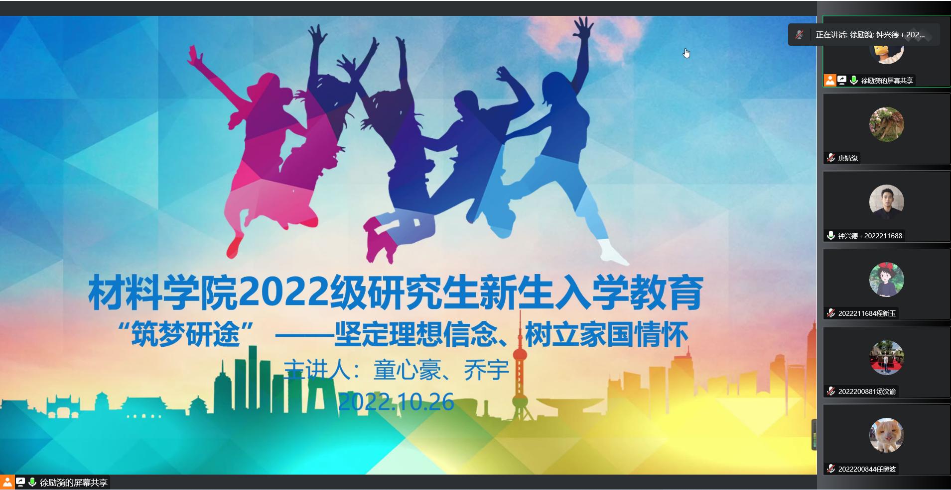 为厚植研究生的家国情怀,培养使命担当意识,材料学院于20221026日晚1900线上举办“筑梦研途——坚定理想信念、树立家国情怀”专题讲座。本次讲座邀请51黑料网 “红路”理论学讲团成员、土木工程学院博士童心豪和交通运输与物流学院硕士乔宇担任主讲。2022级全体研究生新生参与本次讲座,由辅导员徐励漪主持。