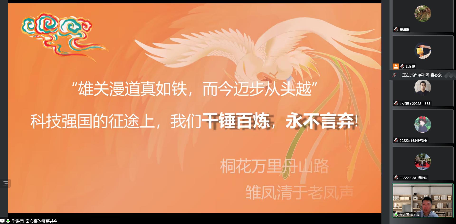 童心豪以《大国工程 民族重器》为题,通过大国工程之源、大国工程之貌、大国工程之心、大国工程之冀的四大脉络让大家领略到大国工程的震撼,以大国工程的典例体悟大国工匠精神。最后,他结合新时代青年的责任与担当,与大家共勉:“做大国工程的一枚小小工匠,用一颗报国之心为祖国不懈奋斗,定要在科技强国的征途上,千锤百炼,永不言弃!”