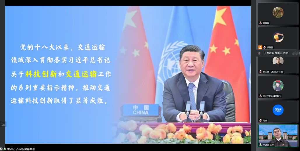 随后,乔宇以《这十年——交通科技自强之路》为题,从交通人的使命变化出发,将公路、铁路、水路和航空四种交通运输方式的变革串联起来,展示了所有交通人在交通科技自强的征程中不断奋斗拼搏,最终绘制成波澜壮阔的历史画卷,带领大家一步一步深入感悟习近平总书记关于科技创新和交通运输工作的系列重要指示精神。最后,乔宇鼓励大家承担起“与世界相交,与世界相通”的历史使命,点燃了大家“自胜者强”的奋斗激情。