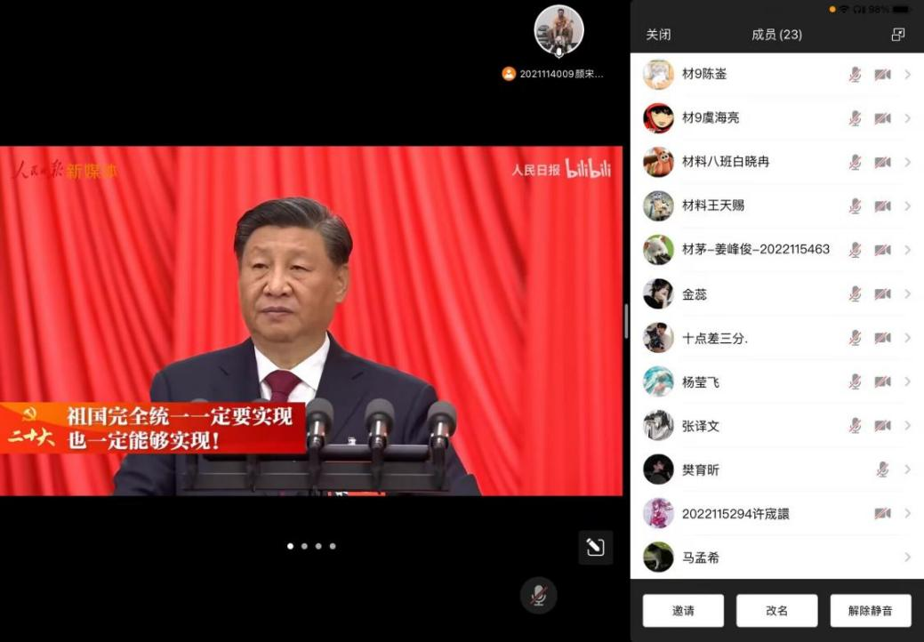 由于疫情原因,材料学院学生会组织工作人员于10月16日晚19:00线上学习观看了党的二十大开幕会视频,认真聆听习近平代表第十九届中央委员会向大会作报告,掀起了学习党的二十大精神的热潮。