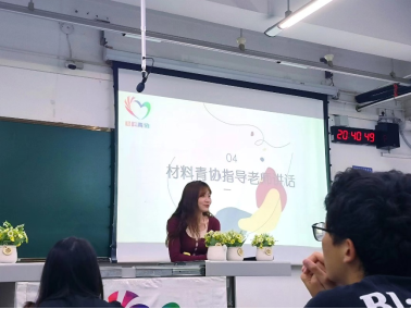 大会第三部分,材料青协指导老师罗莉在大会上致辞。她首先对材料青协会长团、部长团这一学年度的工作表示由衷的赞许,并肯定了材料青协的一年来的工作成果。考虑到协会成员所属院系不一,罗莉老师对大家十分关心的专业分流后的留任问题进行详细解答。“忆往昔,成绩鼓舞人心;展未来,我们任重道远”。罗莉老师激励大家始终怀揣志愿热情、学习热情、生活热情,不忘初心,脚踏实地,在未来的日子里共同进步,成为更好的自己。