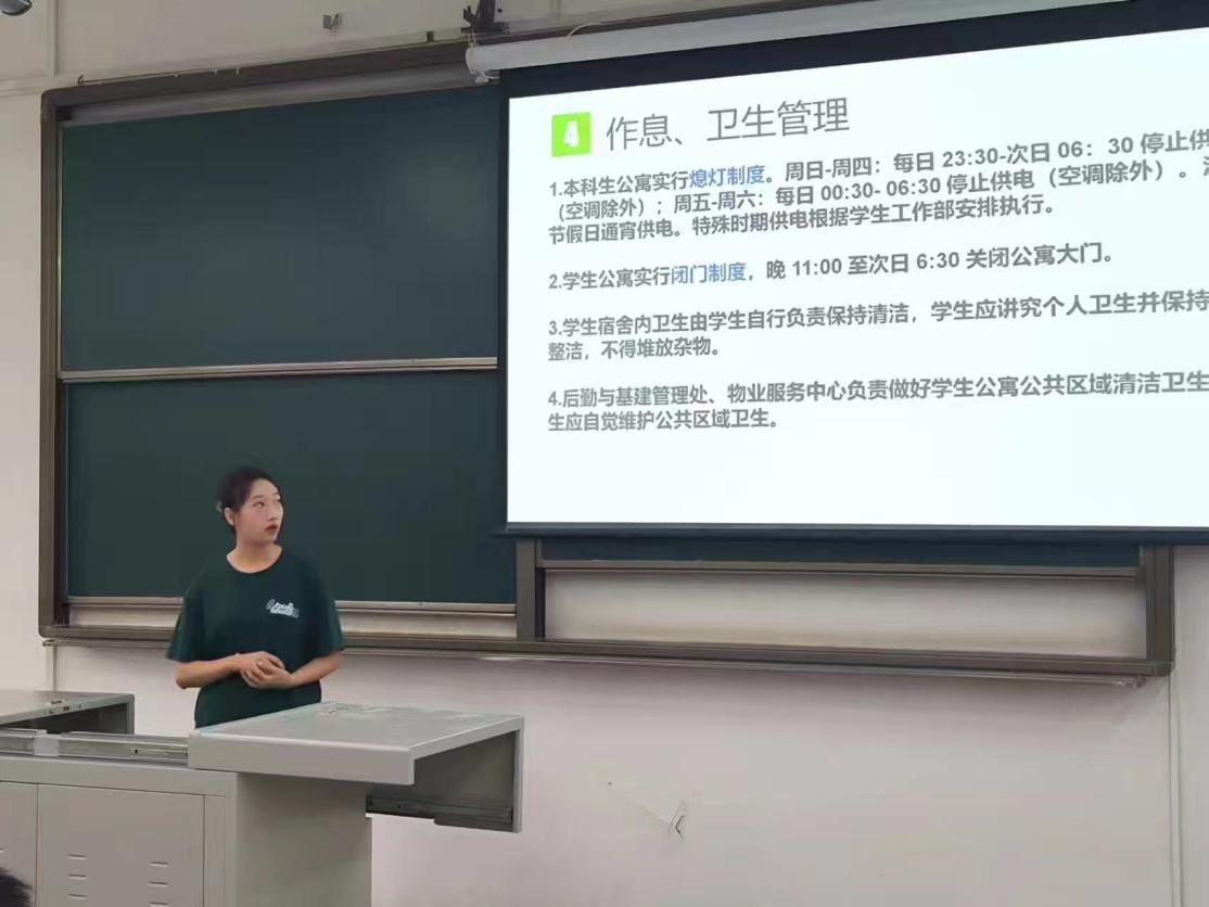 公寓管理办法》,从学生入住、调宿、退宿三个方面向大家讲解学校相关规定,同时结合实际案例,介绍办理流程。后面又详细讲解了宿舍作息、卫生管理、秩序管理、安全管理、处分等板块内容,重点强调了宿舍安全的重要性,提醒学生禁止私拉电线、使用三无产品和违章电器等。学生现场签订了纸质版“学生宿舍入住协议”。