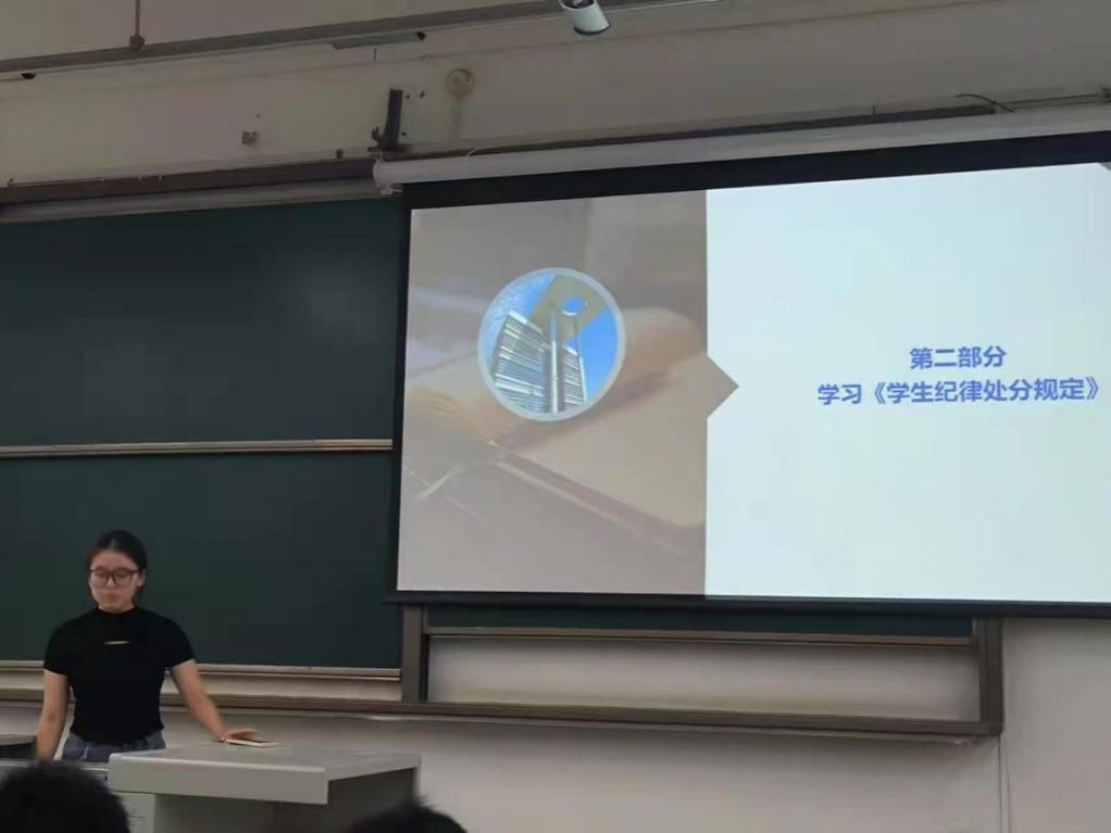 第二部分,辅导员熊心怡带领同学们学习《学生纪律处分规定》,主要从处分种类、高校常见学生违纪行为及相关处分案例为大家讲解,叮嘱同学们严格要求自己,切勿违规违纪。