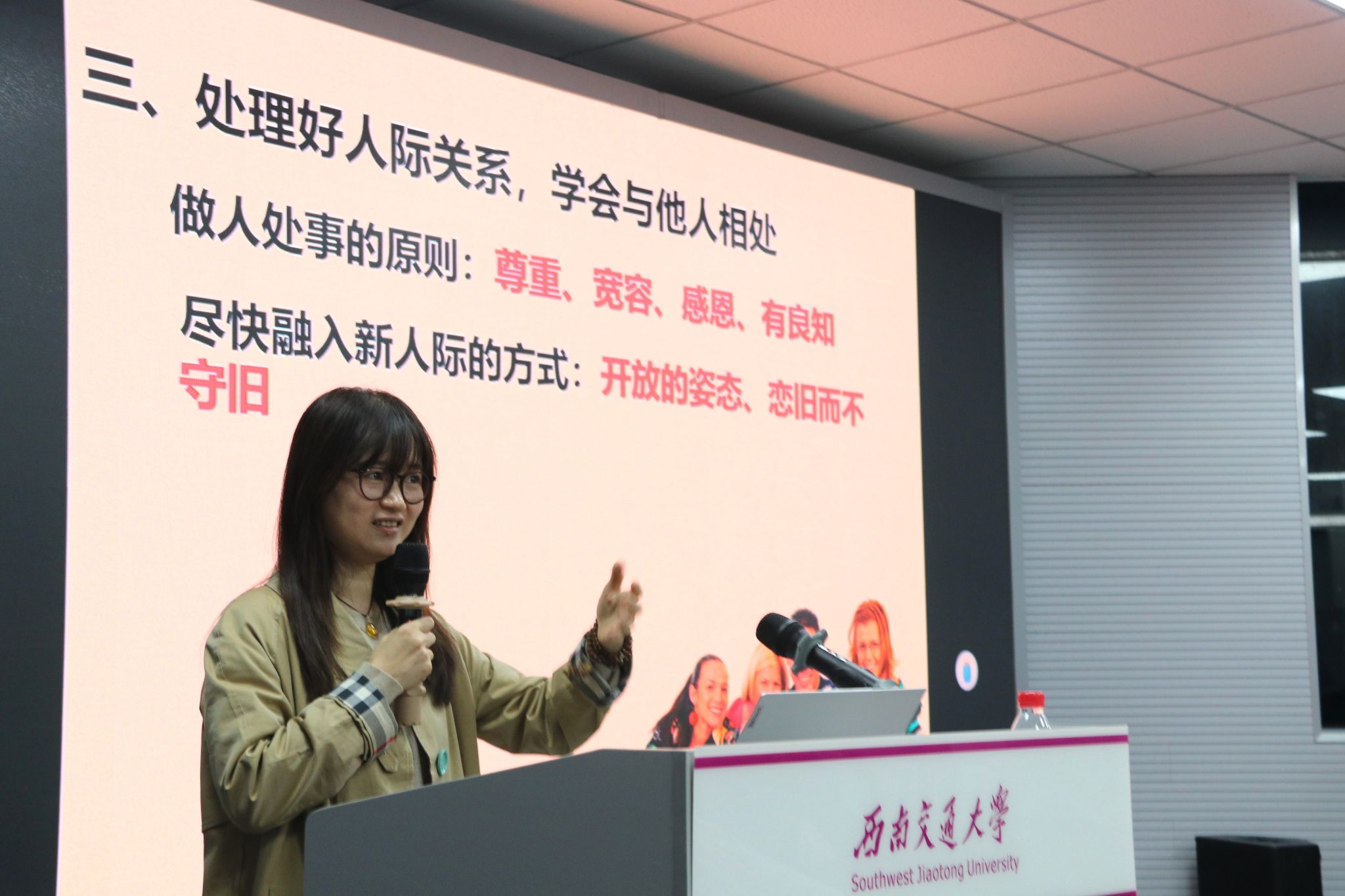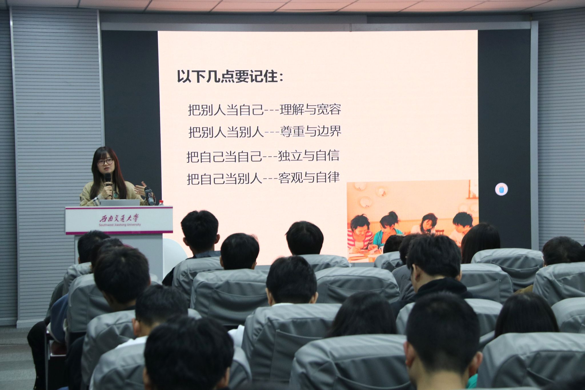 要想真正做到心理健康,冯缙老师建议同学们做到以下四点。第一,学会自学。冯缙老师说道,同学们已经步入研究生阶段,必然是有一定的自学能力,但单单只接触自己专业方向的知识是远远不够的,要多读一些“杂书”,比如天文、地理、生物、哲学、诗歌等,提升自己的文化素养。第二,认识自我。同学们应该充分的认识自己,要在不断地试错中认真思考自己未来想要成为怎样的人,想要做什么事。第三,处理好人际关系,学会与他人相处。冯缙老师表示,真诚且简单是人与人之间相处最舒服的一种状态,同学们应该以“尊重、宽容、感恩、有良知”作为为人处事的原则。第四,密切关注自身身心健康,学会提高调控情绪的能力、学会增强耐挫能力。