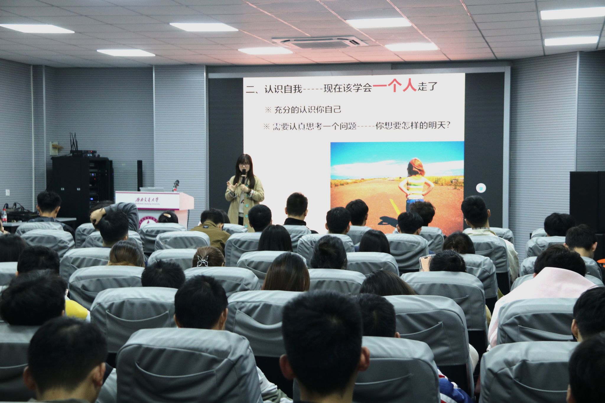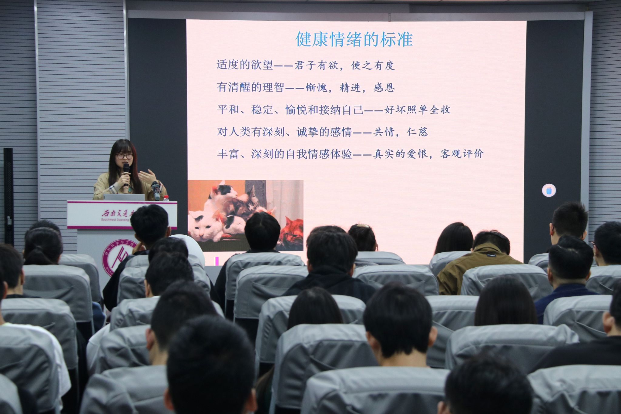 冯缙老师给同学们讲解了心理健康教育的重要性,指出心理咨询的主要工作对象是正常人,处理的是人们的正常需要和问题,消除同学们对心理咨询的误区。