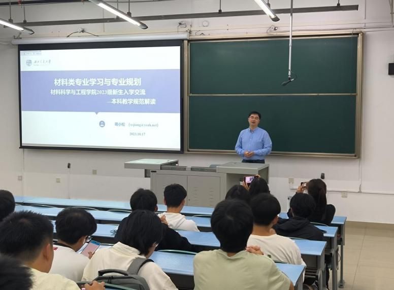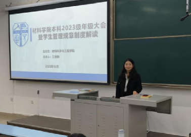 人生新起点,奋斗正当时。为了帮助新生更快适应大学生活、了解大学制度、完成角色转变、顺利成长成才,材料学院于2023年10月17日晚在X2218开展了本科教学管理与学生管理规范解读宣讲会。此次活动由材料学院院长助理、学院青年讲师团成员蒋小松和团委书记王誉静主讲,本科2023级辅导员熊心怡主持,2023级全体同学参加。