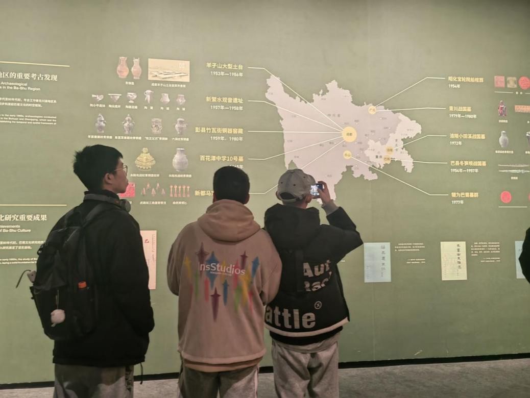 1月12日,实践队来到三星堆博物馆,队员们依次参观了博物馆各个展区,回顾了三星堆遗址近一个世纪的重大考古发现,对遗址的分布范围、堆积状况、保存情况、文化内涵等方面有了全面的认识。青铜大力人像、青铜神树、青铜虎头龙身像、黄金面具等知名文物给队员们带来强烈的震撼。