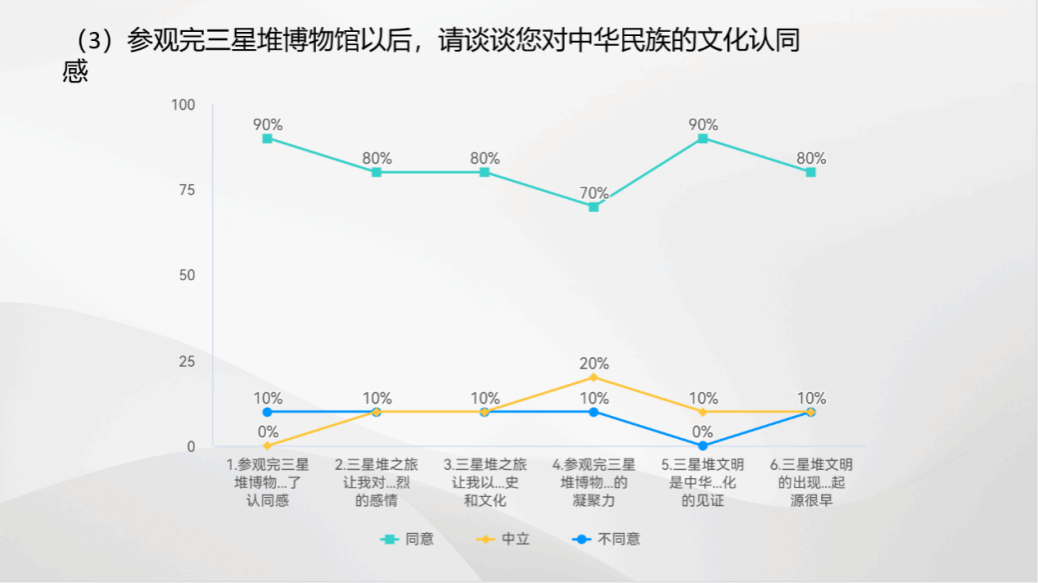 为了解青年学生对三星堆文化以及文物保护研究工作的认识情况,队员们在参观博物馆后组织了问卷调查和现场访谈。调研结果表明:90%的同学都看过三星堆遗址相关的宣传视频、文章等,并希望来到三星堆博物馆切身体验三星堆文化;交通不便是影响游客前往三星堆博物馆参观的主要限制因素。