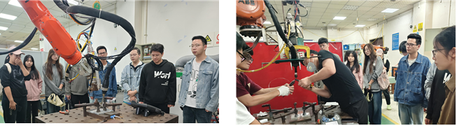 最后,同学们一起进入激光焊接室,参观了从材料与处理到焊接工装,再到焊接运行的全过程,通过从师兄们耐心的讲解中,我们首先了解到了激光焊接机器人有着六轴自由度,可以实现多位姿焊接,并且还重点认识了激光焊接当中的安全隐患和实验注意事项,最后师兄为我们演示了一遍焊接过程(佩戴护目镜和口罩安全演示和参观),对智能化焊接技术有了全新的认识和了解。