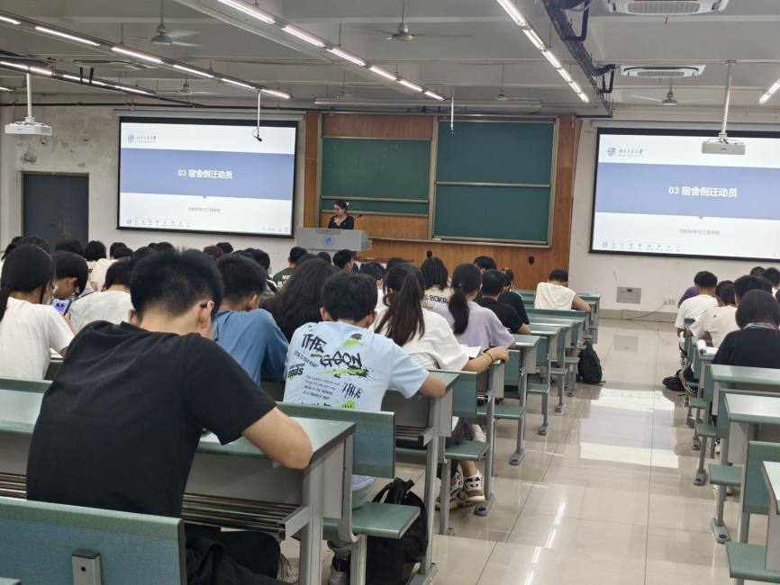 会议的第三项内容为宿舍倒迁动员。熊心怡老师首先对宿舍倒迁整体情况与具体方案进行介绍,明确同学们宿舍倒迁的具体时间与具体要求,针对宿舍倒迁的相关问题进行了说明。她表示,学院将会安排党员同志和志愿者协助同学们开展搬迁工作,提醒同学们提高警惕,保护好自己的贵重物品。她强调,各班班委要做好带头作用,积极出力,同学们积极配合,做到安全搬迁、有序搬迁、顺利搬迁。