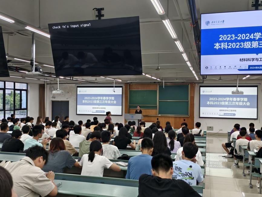 2024年6月11日晚,材料学院本科2023级于X4350召开本学期第3次年级大会。本次年级大会邀请到材料青协指导老师许欢老师、材料青协会长团成员朱宁顺同学参与,本科2023级辅导员熊心怡及全年级同学参会。会议由熊心怡主持。