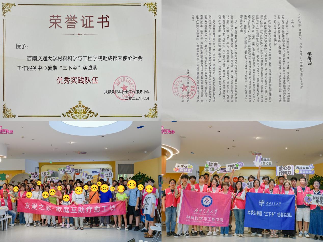本次“‘材’见天使,拥抱爱心”暑期“三下乡”社会实践活动圆满结束,获得了成都天使心社会服务中心及参与家庭的高度认可,被授予“优秀实践队伍”称号并收到感谢信。活动有效推动了高校与公益组织联动,为关爱特殊儿童家庭事业注入了青春力量。材料学院青年志愿者协会表示,将以此次活动为契机,持续深化与成都天使心的战略合作,探索建立长期化、项目化的志愿服务机制,共同打造“校社协同”育人典范。同时,也呼吁更多青年学子关注特殊群体,投身志愿服务,用实际行动传递爱心与希望,彰显青春担当,为构建和谐社会贡献力量。