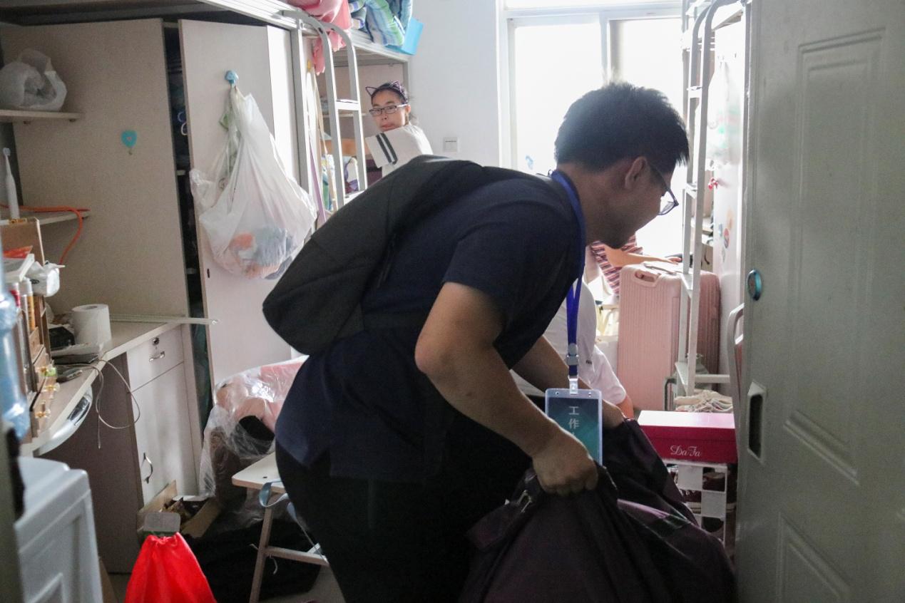 上午11:00,宿舍倒迁工作进入尾声,章书记与辅导员再次走访天佑斋15号楼和17号楼的同学们,询问各寝室状况。