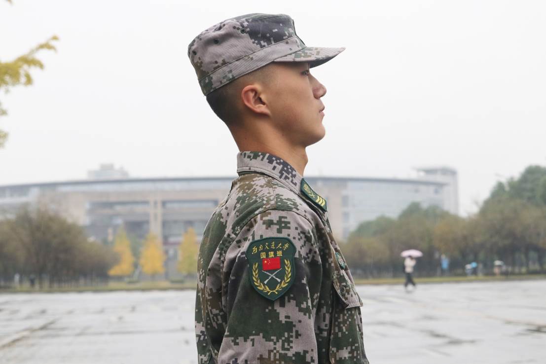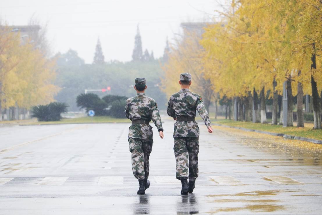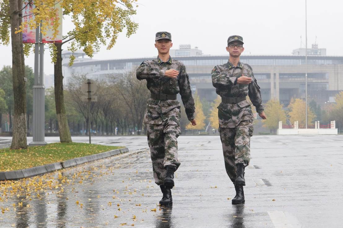 从16栋,到东门国旗台,再到南北交界的国防大道,晨曦与月色中都留下了迷彩绿的身影。彭康学长回忆到,“每次训练30分钟的军姿起初总是很煎熬,但站得久了,我就想象自己是眼前的一颗银杏树,就那么站着,很坚定,也没有什么杂念了,烈日骄阳、风风雨雨都无所谓了,也想象自己是一把刀,直插在地上,为了站出班长所说的刚硬挺拔,腰酸背痛都是小事。”