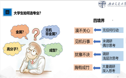 黄老师介绍了四种选择专业的境界:漠不关心、见机行事、犹豫不决、胸有成竹,并告诉同学们选专业既要了解自己的兴趣和长处,也要了解专业的前景和实力。