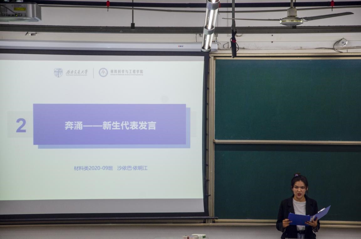 大会第二项,新生代表发言。第一场大会的发言代表是来自材料9班的女生沙依巴·依明江。沙依巴和同学们一起回忆高中生活,展望大学青春,抒发了新生对大学生活和未来的憧憬和期待。第二场大会的发言代表是来自材料8班的男生汪瑀琦。汪瑀琦同学和同学们回顾校史辉煌,感叹中国发展成就,展现了时代青年的满腔爱国热情。他们的发言,让学院领导和老师们感受到了青年学习的朝气蓬勃,看到了交大复兴和民族复兴的无限希望。