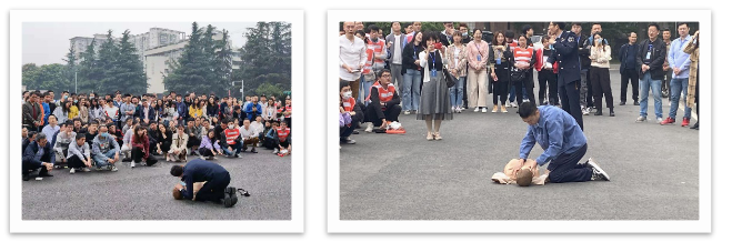 韩教官为师生们现场培训了心肺复苏抢救技能,总结了判断病人意识、识别心脏骤停、进行呼救、拨打120、清除口腔异物、解开多余衣物、进行胸外按压、人工呼吸的流程,并且邀请了两位同学进行现场实践演练,分别抢救了一位“老人”和“小朋友”,紧张又略带搞笑的气氛让大家对心肺复苏抢救有了深刻印象。